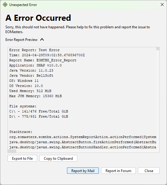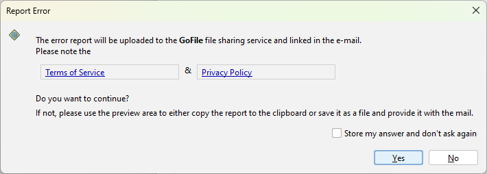 The report is generated, and you can view it in the preview area. You can export and copy the report but you can also send it directly by email or open the EOMasters Forum to report the issue. If you choose to send it by email, you have the option to upload the report to a file sharing service. If so, you need to agree to the Terms of service and the privacy policy of this service at least once.