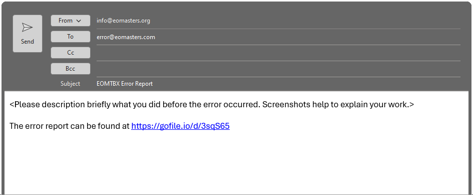 I hope that you will never see this error handler because this would mean that you have found a bug in the EOMTBX. Please help me to fix this and to further improve the EOMTBX by sending me the error report:
