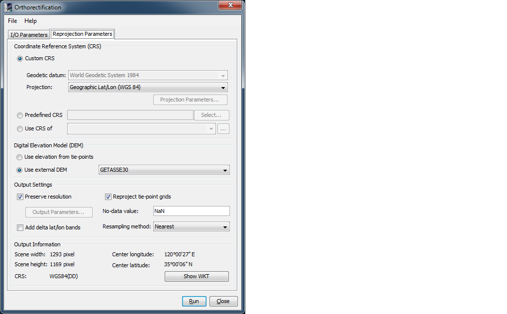 The orthorectification dialog equals the Reprojection Dialog except that a digital elevation model must be specified.