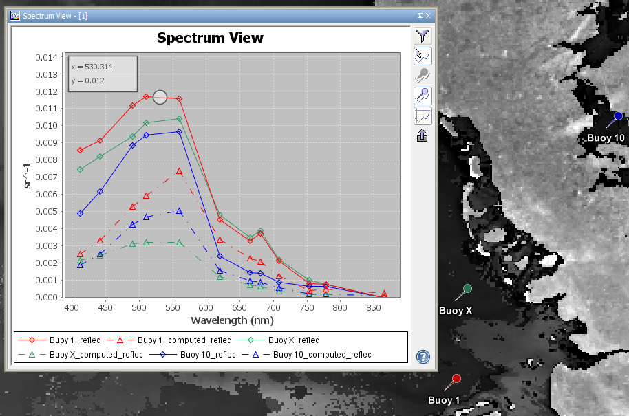 While you move the mouse cursor around a region in the image, you will notice that the diagram axes are automatically adjusted according to the min/max values of the displayed spectral band values.